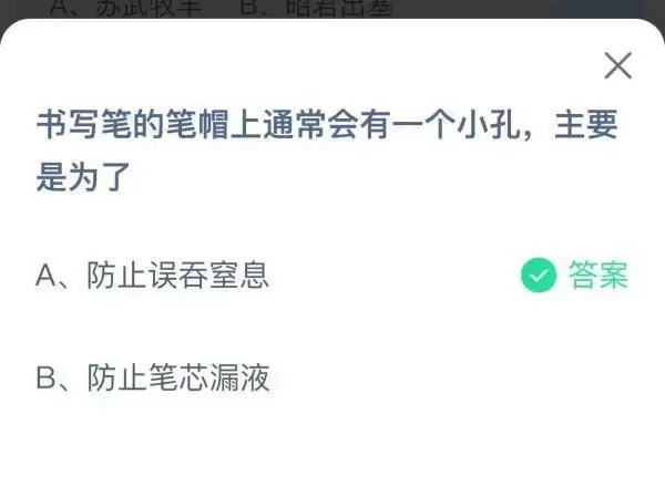 2022支付宝蚂蚁庄园11月2日的题目已经更新了,今天的题目为:书写笔的笔帽上通常会有一个小孔主要是为了?防止误吞窒息还是防止笔芯漏液呢?正确答案是什么,可能很多小伙伴可能还不太清楚。下面小编就为大家带来了正确答案分享,希望能帮助到你。