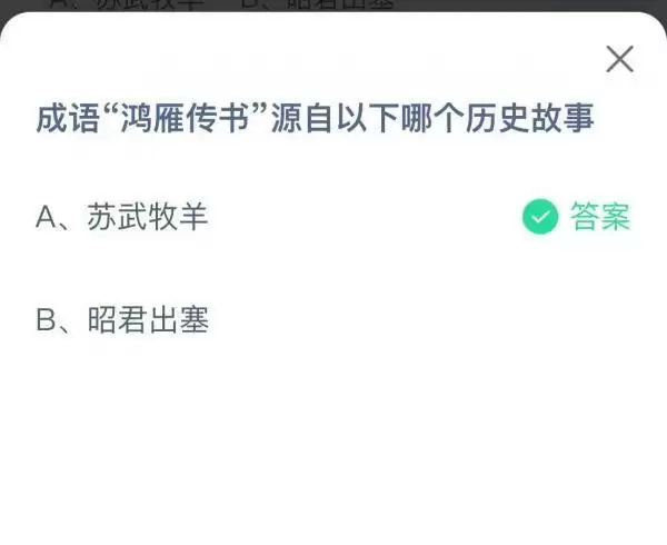 2022支付宝蚂蚁庄园11月2日的题目已经更新了,今天的题目为:成语鸿雁传书源自以下哪个历史故事?苏武牧羊还是昭君出塞呢?正确答案是什么,可能很多小伙伴可能还不太清楚。下面小编就为大家带来了正确答案分享,希望能帮助到你。