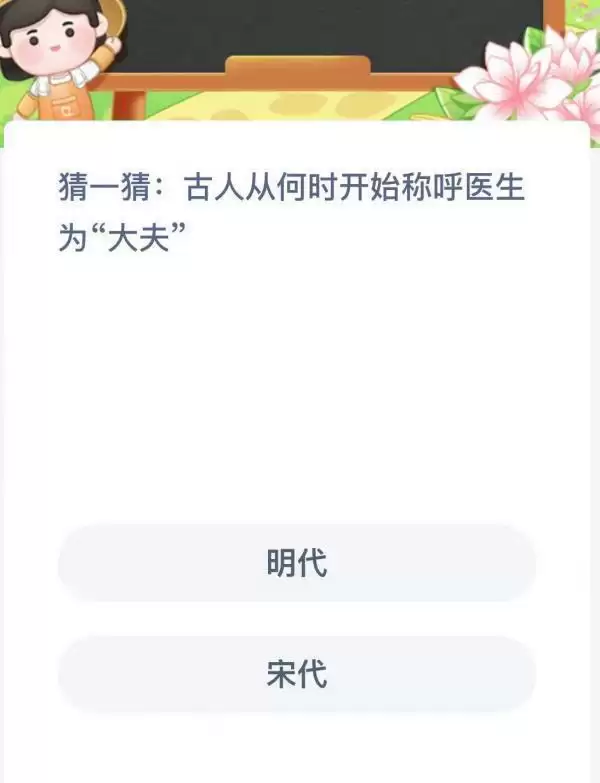 2022支付宝蚂蚁新村11月1日的题目已经更新了,今天的题目为:古人从何时开始称呼医生为大夫?正确答案是什么?明代还是宋代呢?很多小伙伴可能还不太清楚。下面小编就为大家带来了正确答案分享,希望能帮助到你。
