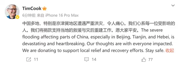 苹果CEO蒂姆·库克刚刚在社交媒体发文表示:"京津冀等地遭遇的严重洪灾令人揪心。我们时刻牵挂着受灾群众,决定捐款支持紧急救援和灾后重建工作。希望大家都能平安度过难关。"