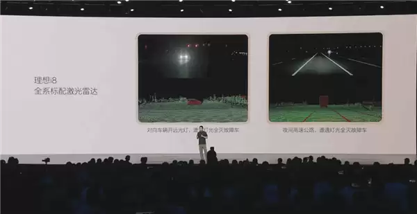 辅助驾驶方面,李想表示,理想i8全系标配激光雷达,夜间无任何灯光条件下,可看清200米外的事故车。而极端光线下的主动安全,也是理想i8标配激光雷达的根本原因。