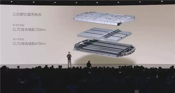 续航方面,标配5C三元锂电池,有90.1千瓦时和97.8千瓦时两种规格,CLTC续航分别为670公里和720公里,支持5C超充,10分钟可补能500公里。