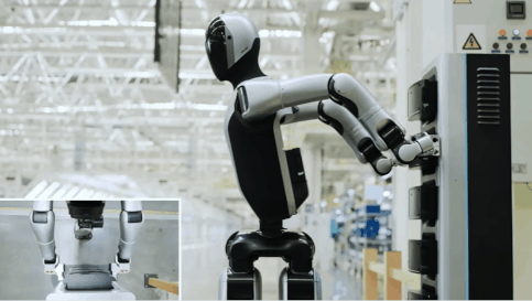人形机器人借助本体定位精度和柔顺控制算法,通过双臂协同作业,实现电池与仓体的精确对准,完成自主换电。