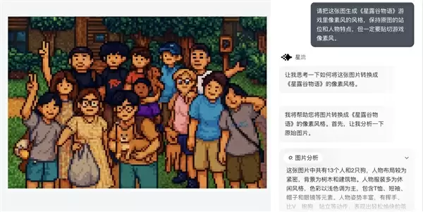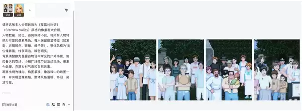 在我尝试了多次,还换了许多 prompt,只想要「把一张合照,换成《星露谷物语》的像素风格」后,我收获到的结果是: