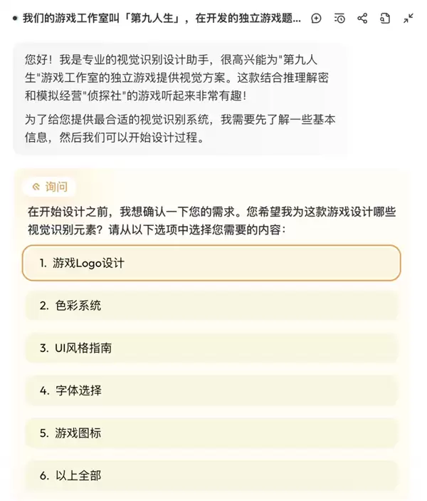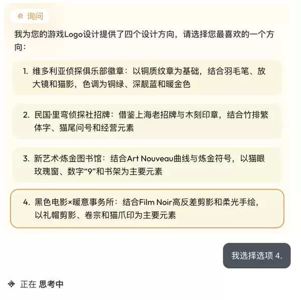 策展 Agent:会先提问引导你澄清主题,比如「你想做的是工作室 logo?游戏宣传海报?还是 UI?」在做出选择后,过渡到下一步。