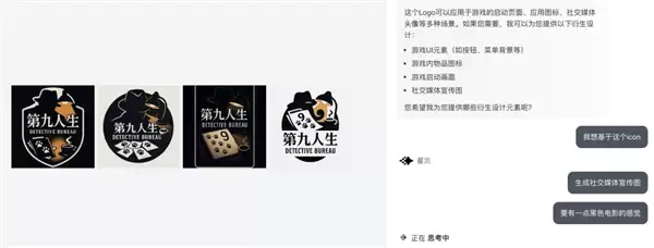 设计 Agent:结合前面的语义理解和图像风格,出主视觉样稿和多种变体草图。在这一步里,它还会根据前文信息,给我汇总出多个设计方向,在看到成品后,Agent 还会反馈我是否需要生成其他场景,比如游戏启动画面、社交媒体宣传图等等。精修 Agent:具体到每一张图中,我还可以在「画板」上进行微调,只需要选住想更改的部分,输入更改指令。
