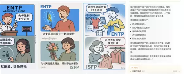 这时,我已经感受到了星流 Agent 的强大,所以决定再给它一次「中文生成」的机会,这次我 prompt 只写下「一系列插画漫画、画面尺寸、内容方向(不同 MBTI 情侣的交流错位)、中文文本」。