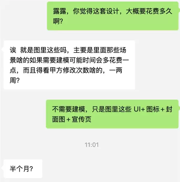 而另一个做电商设计和品牌视觉朋友则说:「半个月?」但又补了一句:「其实乙方的时间,很大程度上都是被甲方反复拉扯,如果急的话,熬个大夜也能做完。」