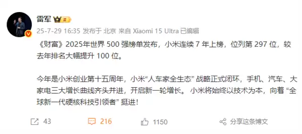 7月29日,2025年度《财富》世界500强榜单正式揭晓。小米集团位列第297名,较去年大幅跃升100位,创下自2019年首次入围以来的最大排名提升幅度。