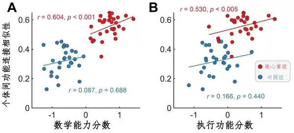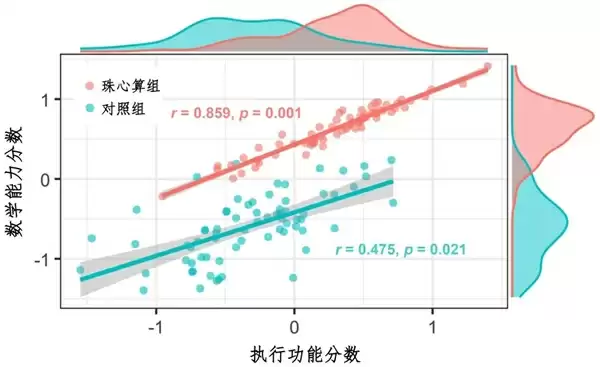 研究发现,珠心算组儿童的执行功能和数学能力之间的关联强度显著高于对照组。这表明长期的珠心算训练让这两种能力在认知结构上更紧密地“绑定”在一起。