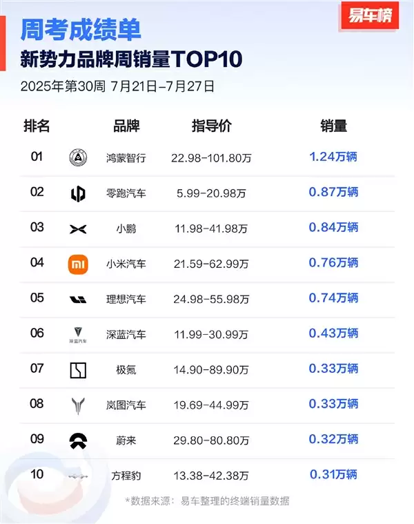 科技7月29日消息,又到周二,又是新势力交作业的时候,易车发布了周销量(2025年第30周)榜单前十名。