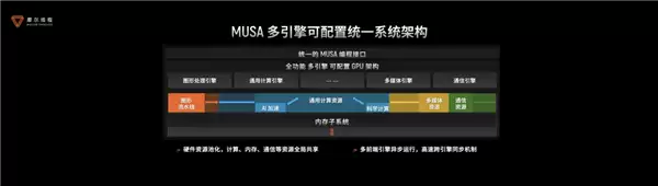MUSA架构,是创新的多引擎、可伸缩GPU架构,通过硬件资源池化及动态资源调度技术,构建了全局共享的计算、内存与通讯资源池。这一设计不仅突破了传统GPU功能单一的限制,还在保障通用性的同时显著提升了资源利用率。