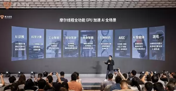 摩尔线程的全功能GPU能够支持以上全部精度的训练推理,从而实现AI训练推理、科学计算、工业智能、自动驾驶、具身智能、生物制药、AIGC、AI智能体、游戏等全场景AI加速。