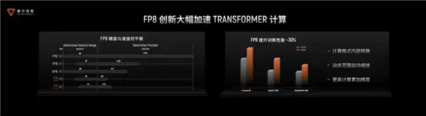 在计算层面,摩尔线程的AI加速系统(TCE/TME)全面支持INT8/FP8/FP16/BF16/TF32等多种混合精度计算。作为国内首批实现FP8算力量产的GPU厂商,其FP8技术通过快速格式转换、动态范围智能适配和高精度累加器等创新设计,在保证计算精度的同时,将Transformer计算性能提升约30%。