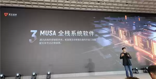 有了单芯片的算力,还需要实现单节点的高效率,摩尔线程的MUSA全栈系统软件,通过高效的基础软件库,框架算法创新和完备的开发工具链提升了单节点计算效率。