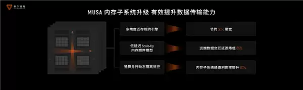 内存系统方面,通过多精度近存规约引擎、低延迟Scale-Up、通算并行资源隔离等技术,实现了50%的带宽节省和60%的延迟降低。