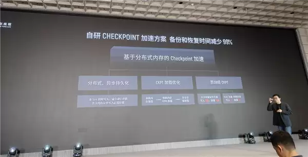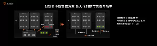 最后也是最重要的一点,那就是稳定性,集群不稳定的话,再高的性能再快的效率也没有任何意义,为此摩尔线程推出了零中断容错技术,故障发生时仅隔离受影响节点组,其余节点继续训练,备机无缝接入,全程无中断,这也使得KUAE集群有效训练时间占比超99%。