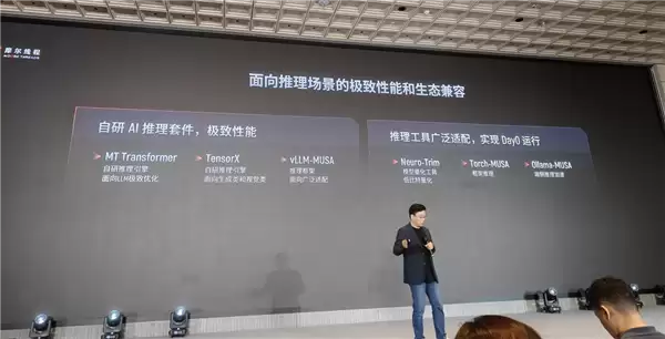 大模型训练完成后,还需要进行推理验证,摩尔线程的推理解决方案基于MT Transformer自研推理引擎、TensorX自研推理引擎和vLLM-MUSA推理框架,为模型验证和部署提供极致性能支持。