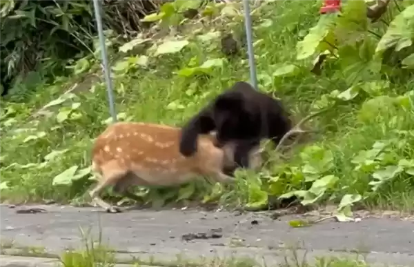 视频中,棕熊狠狠咬住鹿的颈部,尽管鹿奋力挣扎、发出哀鸣,却最终无力反抗,命丧熊口。