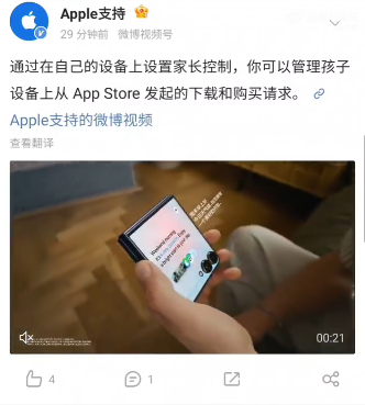 据网友反馈,该账号在微博上发布了一则消息,配文是介绍苹果设备的家长控制功能,然而下面配的却是三星Galaxy Z Flip7的宣传视频。