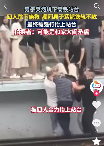 男子突然跳下高铁站台 四人施救扔紧抓铁轨不放 最终被强行抬上来