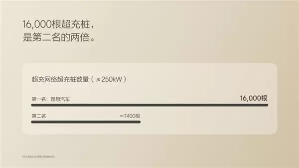 在过去这两年里,理想为了解决纯电车型的续航焦虑问题化身基建狂魔。截至目前,其充电速率超过250千瓦的充电站的数量已经超过3,000座,超充桩的数量超过16000根,这个数字是第二名的两倍。
