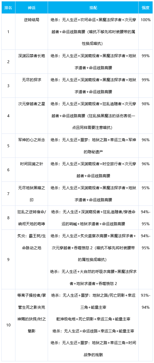 DNF男大枪奥兹玛神话排名第一是逆转结局,第二是深渊囚禁者长袍,第三是无尽的探求,第四是次元耳环,第五军神耳环,第六时间回溯之针,第七大幽魂耳环。