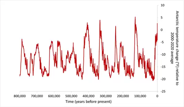 △ 南极洲 80 万年前至2022年的平均地表温度,来源:参考3