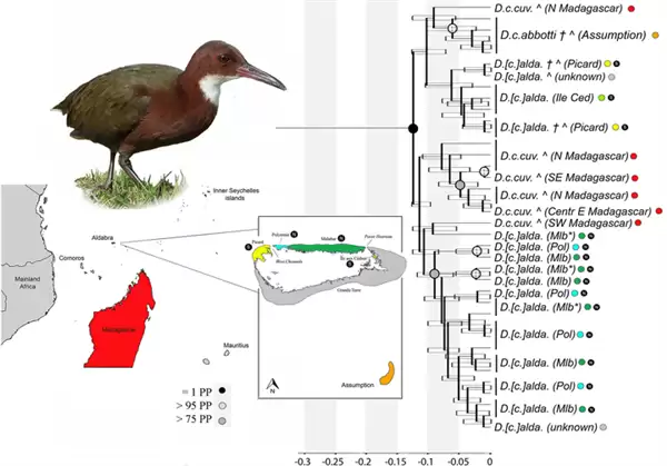 2019年一项发表在《林奈学会动物学杂志》的研究揭示了原因,13.6万年前“阿尔达伯拉秧鸡”确实灭绝了,但是因为相同的环境,现代的阿尔达伯拉秧鸡重新演化了出来[1]。