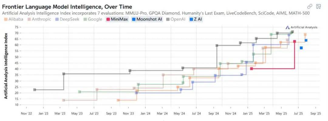 上海与北京加入开源的三城演义,是被DeepSeek逼出来的。从AI分析机构Artificial Analysis的前沿模型智能趋势就能发现,无论是上海的MiniMax,还是北京的月之暗面或智谱,首个纳入统计的模型都出现在2025年后。尤其是北京的两家,更是首次亮相。好在,它们正在迅速追齐。