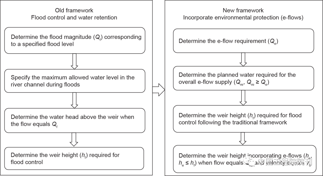 (1)根据旧框架确定的堰高,会导致生态流量需求过大,现有可利用水资源可能难以满足生态流量需求。新框架在确定堰高前,会重新评估生态流量和生态补水可用的水资源量,并根据可用水量来确定堰高,而非如旧框架中只着眼于防洪的要求。根据新框架确定的堰高,更适用于河流生态流量保障和流域水资源管理。