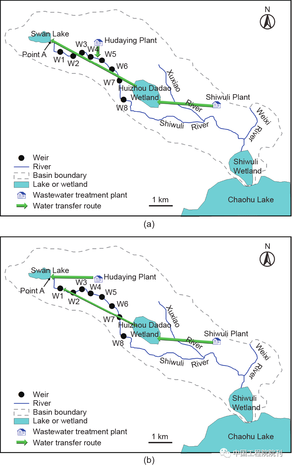 在确定了可接受的堰高范围后,我们通过择优设计生态流量的供水路线和调度方案,并将流速阈值设置为 0.2 m·s–1,以进一步确定优选的堰高。之前的供水路线 [图2(a)]将十五里河污水处理厂的污水调配到紧靠天鹅湖下游的河流中。所需的管道长度将超过21 km,每天将向上游输送1.16 m3 ·s–1的水量(1.0 × 105 t·d–1)。