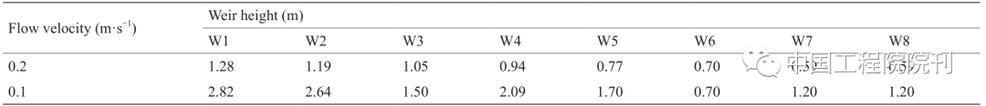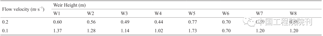 表3总结了上述稳定补水条件下各堰相应的堰高,表中的数值是此情景下满足0.1 m·s–1流速要求的堰高上限阈值。