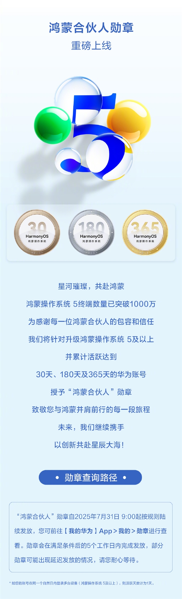 鸿蒙合伙人勋章自2025年7月31日 9:00起按规则陆续发放,用户可前往我的华为App>我的>勋章进行查看。