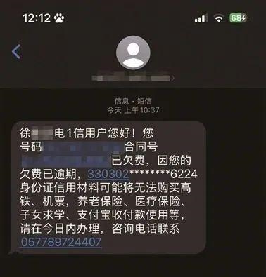 根据短信显示,因欠费已逾期,该女子身份证信用材料可能将无法购买高铁、机票、养老保险、医疗保险,影响子女求学、支付宝收付款使用等。