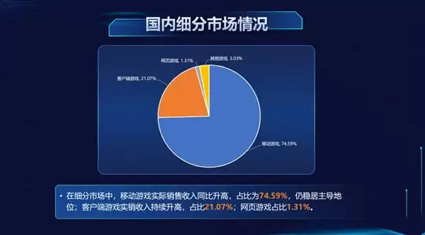 从具体市场构成来看,移动游戏已稳居主导地位。中国移动游戏市场实际销售收入为1253.09亿元,占比达74.59%,同比增长16.55%,持续引领行业发展。