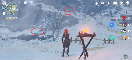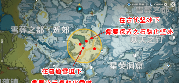 图中,左下角的信标在雪堆下方,需要准备火元素攻击来融化雪堆。