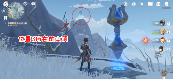 位置3:同样位于山顶,从传送锚点开始,可以直接飞到目标山的半山腰,之后继续向上攀爬来到目标地点放置信标即可。注意事项同上,就不再赘述,尽快攀爬放置后可以快速传送到其他传送点,以避免严寒值达到上限。