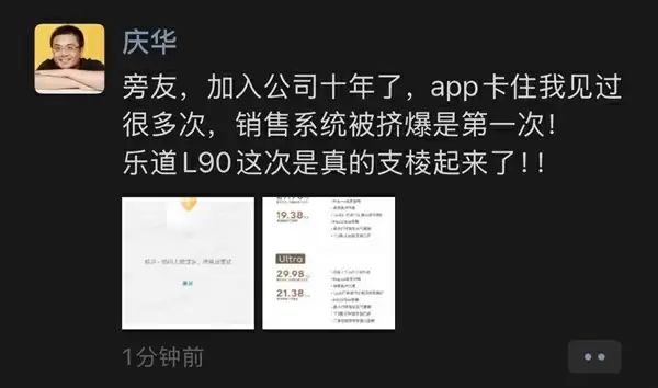 不出意外,L90卖爆了,乐道副总裁夏庆华激动地发布朋友圈表示,自己加入蔚来十年了,app卡住的情况见过很多次,但销售系统被挤爆是第一次,“乐道L90这次真的支棱起来了!”