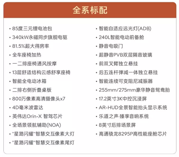 L90的标配已然十分丰富,包括85度三元锂电池包、ADB智能大灯、静音鸳鸯胎、车载冰箱等等,具体可参考下图。