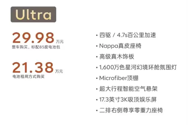 Ultra版比Max版贵了2万元,多了一台电机,零百加速提升到4.7秒,同时还增加了二排右侧尊享零重力座椅,其他则和Max版保持一致。