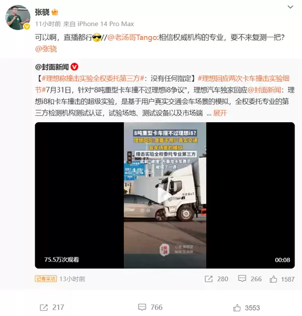 当晚,理想汽车产品负责人@老汤哥Tango 在社交平台回应称:"我们相信专业机构的测试结果,愿意接受复测挑战。"随后产品线负责人张骁更直接表态:"随时奉陪,直播测试也没问题。"