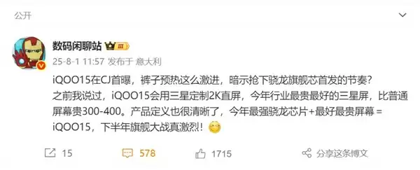 该博主还爆料,iQOO15采用三星定制2K直屏,这是今年行业最贵最好的三星屏,比普通屏幕贵300-400,今年最强骁龙芯片+最好最贵屏幕=iQOO15。