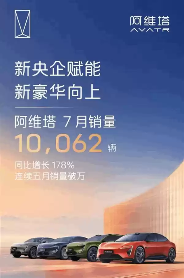 连续5个月销量破万!阿维塔7月销量10062辆 同比大涨178%