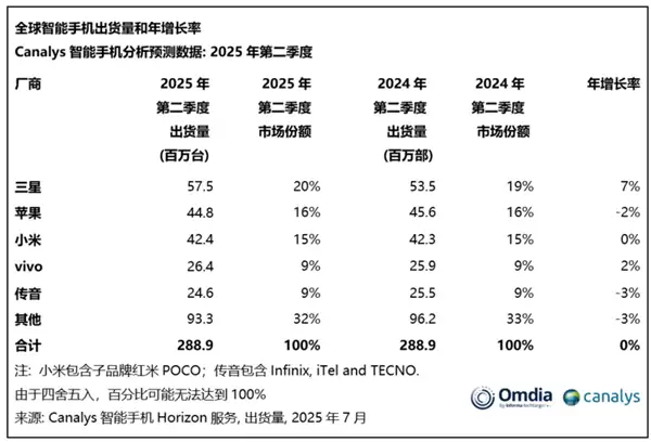 2025年Q2全球手机出货量出炉:三星夺冠 小米稳居第三