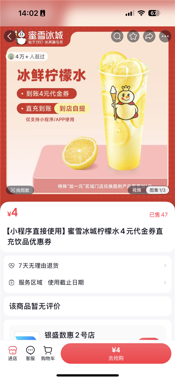 需要补充的是,笔者搜索发现,在网上平台购买蜜雪冰城冰鲜柠檬水,页面显示仅需4元即可,可到店自提。