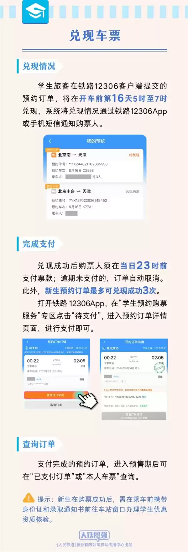学生旅客提交的预约订单,会在开车前第16天5时-7时兑现,系统会通过铁路12306 APP或手机短信告知购票人兑现情况。若兑现成功,购票人须在当日23时前支付票款,逾期未支付订单将自动取消,且新生预约订单最多可兑现成功3次。