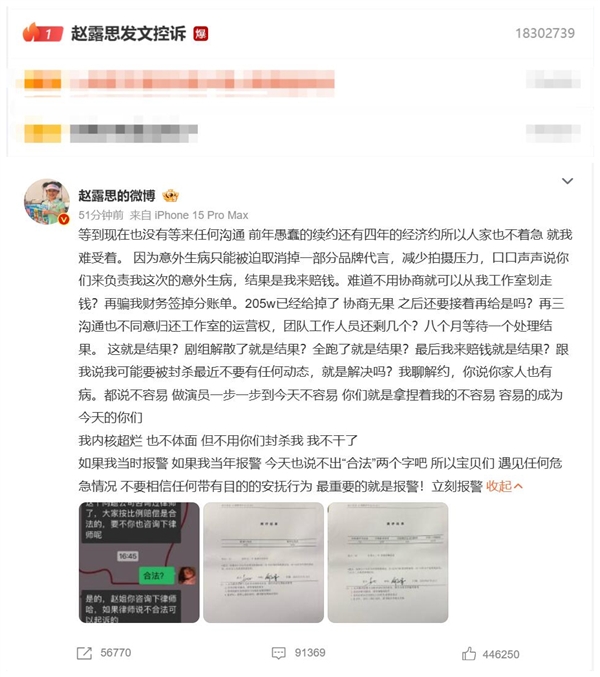 热搜第一!赵露思发文控诉经纪公司:我不干了