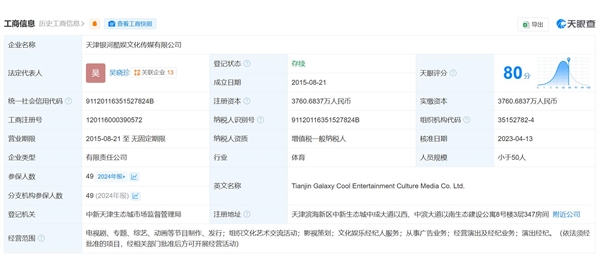 公开报道显示,赵露思的经纪公司为银河酷娱传媒,运营主体是天津银河酷娱文化传媒有限公司。天眼查相关信息显示,天津银河酷娱文化传媒有限公司的注册资本是3760.6837万人民币,成立时间是2015年8月。