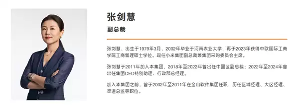 2024年5月,小米首次同时任命两位女性高管,许斐担任集团副总裁兼集团CMO,张剑慧担任集团副总裁兼集团采购委员会主席。